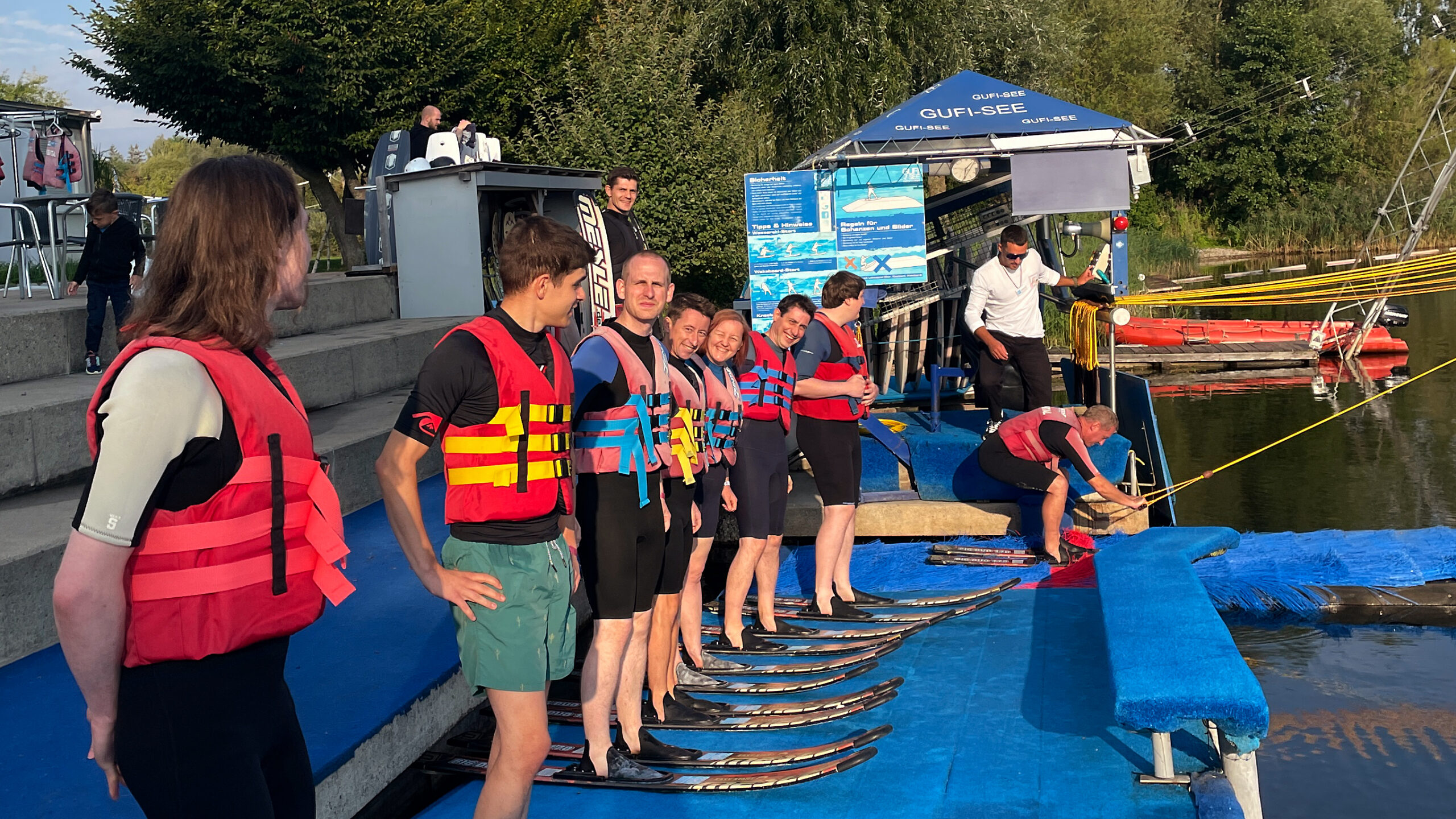 Obwohl das Wetter erst nicht sehr vielversprechend aussah, machten wir uns letzten Mittwoch nach getaner Arbeit auf den Weg zum Gufi-See in der Nähe von Gundelfingen. Dort tauschten wir Bürostühle gegen Neoprenanzug und Wasserski und tobten uns auf der Anlage aus.