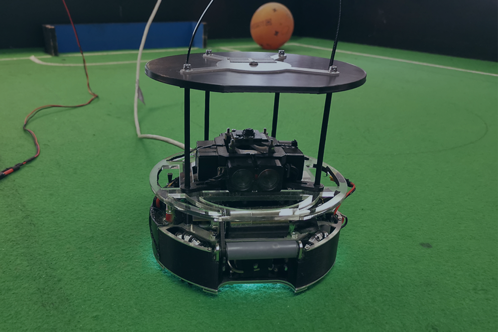 Das Titelbild des Beitrages zeigt einen Roboter, der für den größten Technik-Schülerwettbewerb RoboCupJunior entwikelt wurde und dort im Bereich "Soccer" antritt. Entwickelt wurde der Roboter von Schüler:innen des Lessing Gymnasiums in Neu-Ulm.