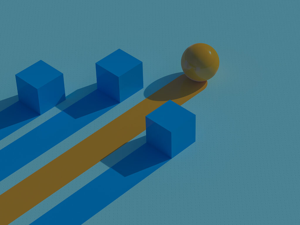 Das Beitragsbild des Blogartikels zeigt vier Formen – drei blaue Würfel und eine orange Kugel. Die Kugel bewegt sich schneller und steht hier für die optimierte Produktion.
