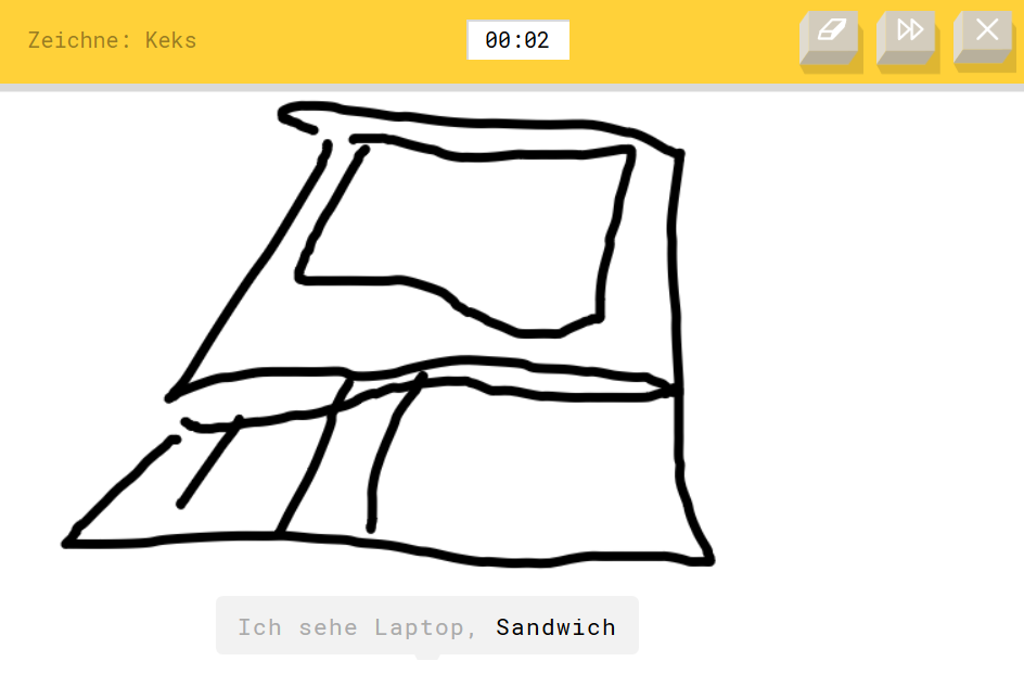 Google zeigt in seiner Anwendung Quickdraw, dass nicht nur Fotos eingeordnet werden können. Wer also gerade keine Kamera zur Hand hat und kein Stockfoto segmentieren lassen will, kann sich hier mit einem digitalen Stift austoben. Unser Testzeichner hat, um das System zu testen, natürlich keinen Keks gemalt, sondern einen Laptop. Und dieser ist noch nicht mal schön, sondern krumm und schief; mit überlappenden Linien. Trotzdem erkennt das Netz den Laptop. Es könnte aber auch ein Sandwich sein.