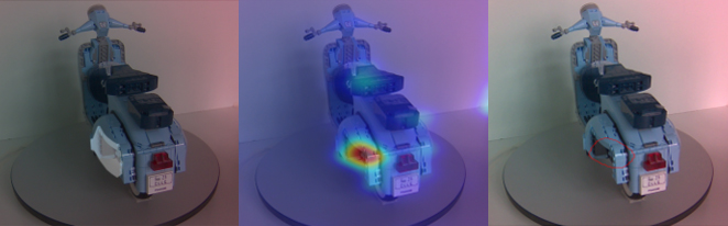 Foto der realen Vespa mit überblendeter Maske von fehlendem Teil (links), Heatmap (mitte) und Segmentierung (rechts).
