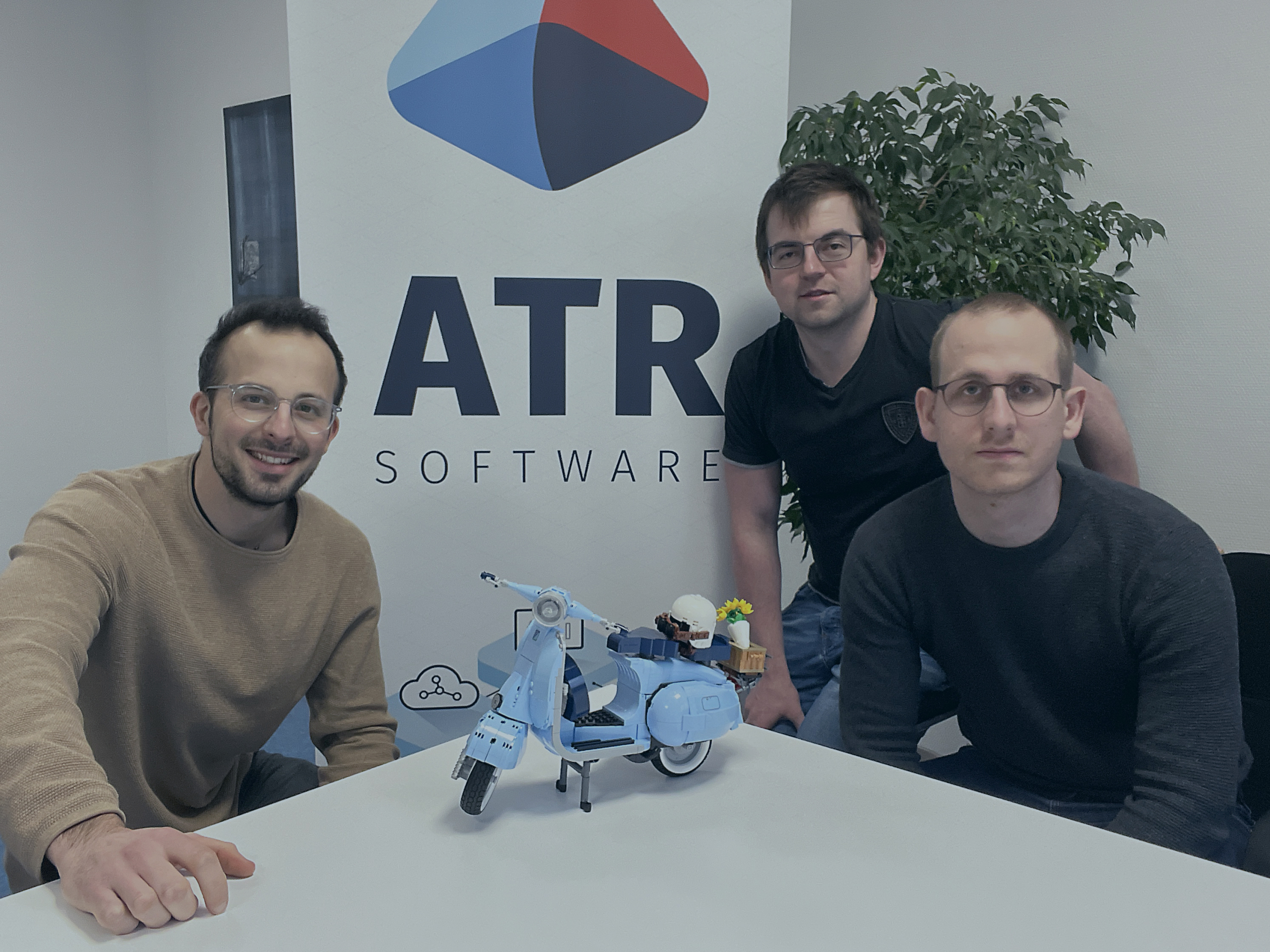 Das Tielbild zeigt drei Kollegen von ATR Software mit dem zusammengebauten LEGO Modell einer Verspa