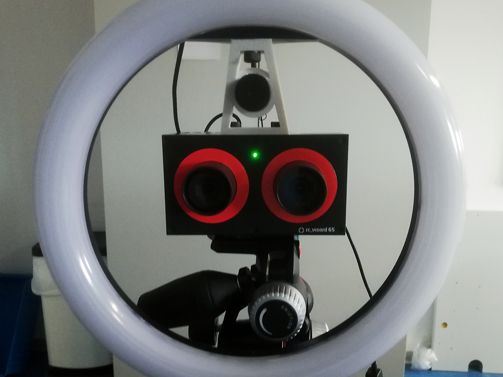 Durch das Ringlicht bekommen wir in den Versuchen eine konstante Helligkeit in den Bildern, die zur gewählten Belichtungszeit passt. Dadurch verbessert sich die Menge an erkannten Punkten und mit dieser wiederum die Genauigkeit der wahrgenommenen Tiefe. Je mehr markante Stellen im Bild vorhanden sind, desto besser kann der Abstand zur Kamera bestimmt werden. Deshalb modifizierten wir die Halterung des Ringlichtes, sodass ein Laserpointer mit Streuung darin eingespannt werden kann. Dieser wirft nun ein Punkteraster auf den Bereich, der von den Kameras aufgezeichnet wird. Durch die zusätzlichen Punkte des Laserpointers ist es uns möglich, die Tiefe auch an Stellen gut zu bestimmen, an denen die Farbe der aufgezeichneten Objekte sehr einheitlich ist.