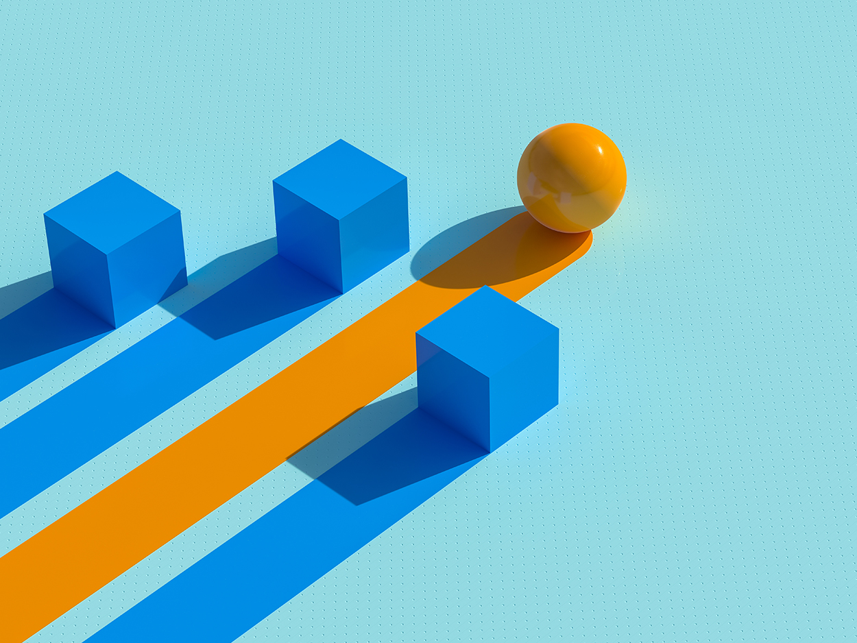 Das Titelbild zeigt vier Formen – drei blaue Würfel und eine orange Kugel. Die Kugel bewegt sich schneller und steht hier für die optimierte Produktion.