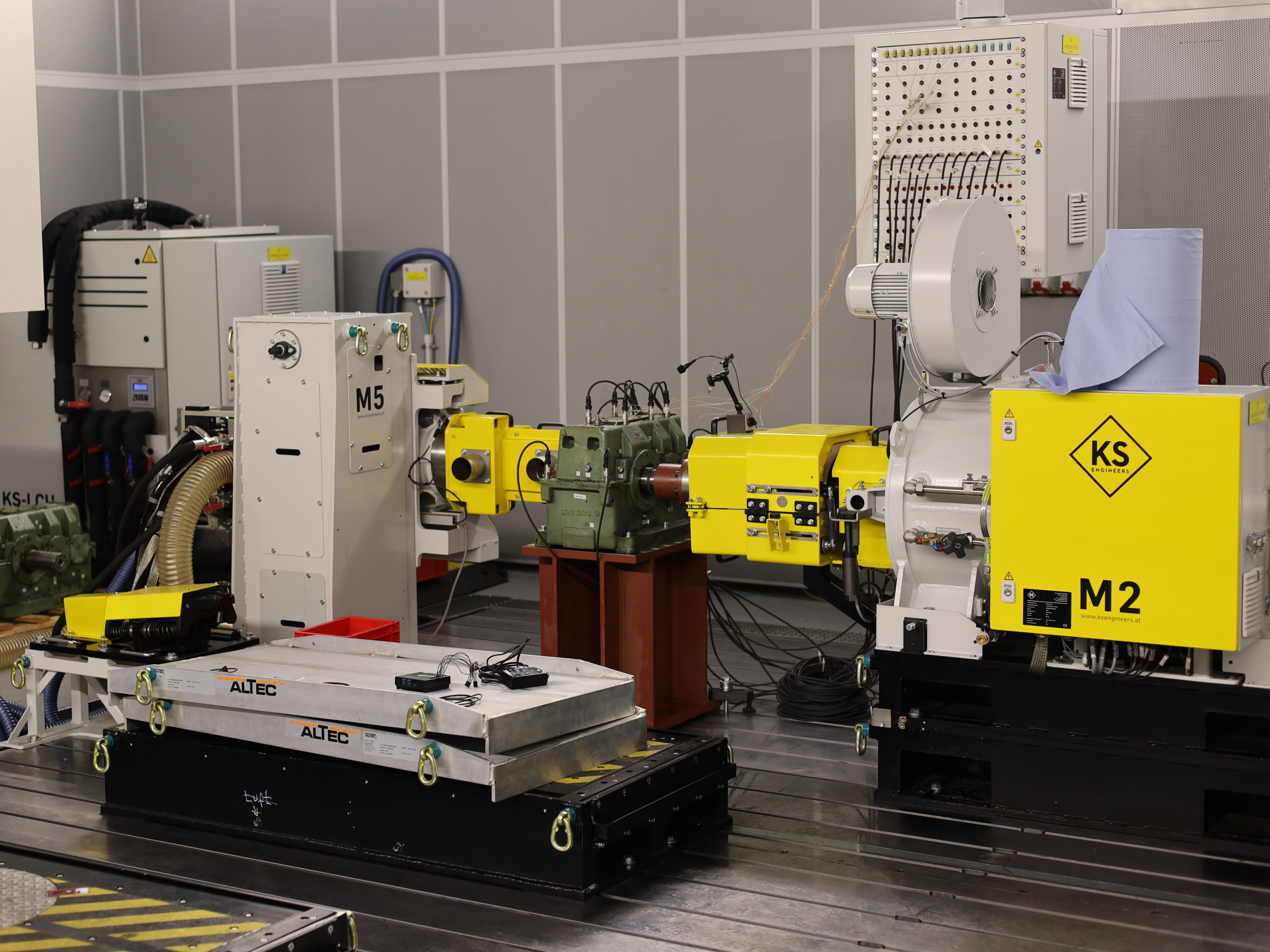 Messung eines alten Getriebes am Prüfstand der Hochschule Aalen. Zur Erfassung der Daten ist das Getriebe mit zahlreichen Sensoren verknüpft.