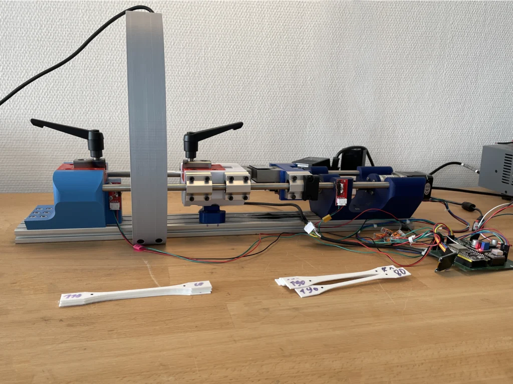 Als Teilergebnis des Forschungsprojektes DigiPrüF, dessen Ziel die Erforschung Digitaler Zwillinge für die Fahrzeugindustrie ist, haben wir eine solche Zugmaschine konstruiert. Sie kann nicht nur standardisierte Testverfahren durchführen, sondern auch flexibel konfigurierbare Belastungsszenarien auf die Zugprobe anwenden.